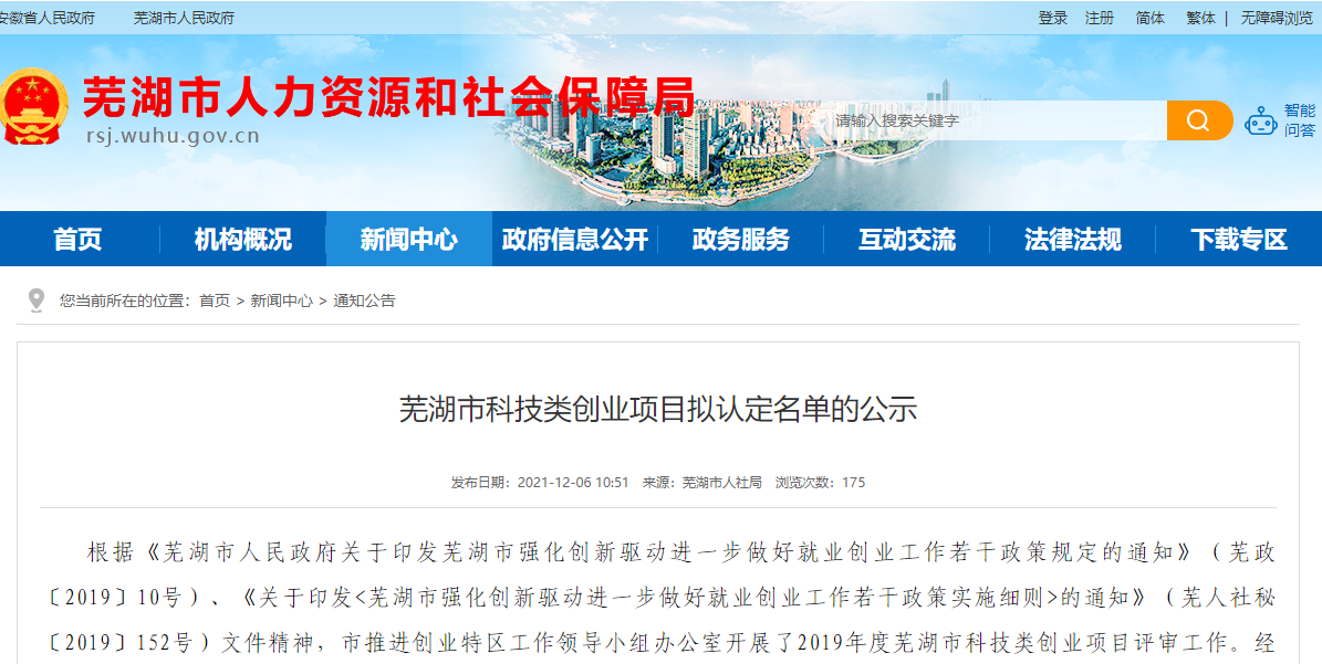 新聞喜訊2021年11月20日,由安徽省蕪湖市人力資源和社會保障局、蕪湖市財政局、蕪湖市科技局等單位牽頭組織開展“2019年度科技類創業項目評審的評選工作”,經...
